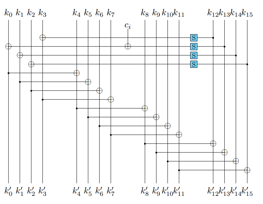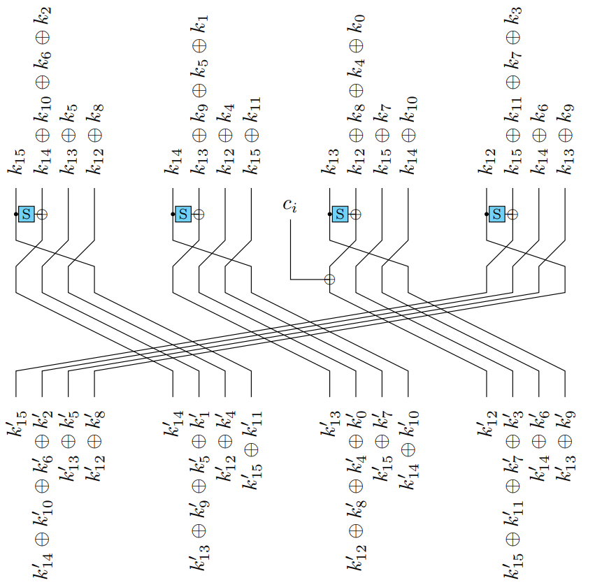 In this chall we are presented with a cipher entierely based on the AES key schedule derivation function. Seing such a “well known” construction hints us towards the literature.